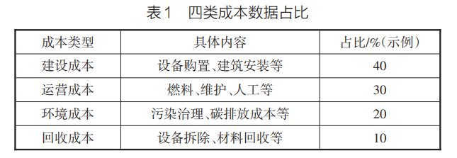 建立全生命周期成本管理模型,需系统整合建设、运营、环境与回收四类核心成本。以典型火电项目为例,初期建设投入约占总成本四成,涵盖设备采购与土建安装等刚性支出;运行阶段燃料消耗与设备维护持续吞噬三成预算,直接影响项目经济性;环境治理与碳配额交易推动外部成本内部化,占比趋于上升;退役期资源回用与废弃物处置虽仅占一成,却对绿色拆解与材料再生提出技术与管理的双重挑战 (表 1)。通过动态测算各阶段成本关联,识别关键控制节点,可实现从投资决策到报废回收的闭环管理,提升造价控制精度与资源配置效率。