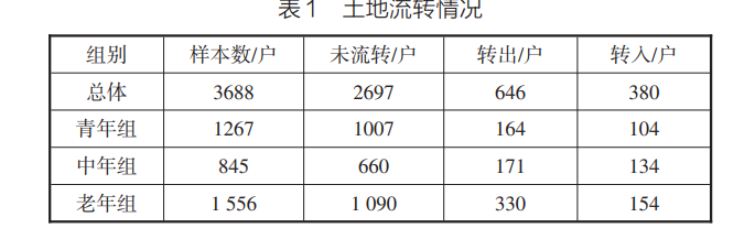 本文将农户划分为青年组、中年组及老年组,青年组年龄16~44岁,中年组年龄45~54岁,老年组年龄55~100岁。如表 1 所示,在总样本 3688 户中,未流转农户有2697 户,为 73.13%,流转农户有 991 户,为 26.87%;转出户为646户,占17.52%,转入户为380户,占10.30%。青年组转出户有164户,占12.94%,转入户有104户,占8.21%;中年组转出户有 171 户,占 17.91%,转入户有134 户,占 14.03%;老年组转出户有 330 户,占 21.21%,转入户有154户,占9.90%。