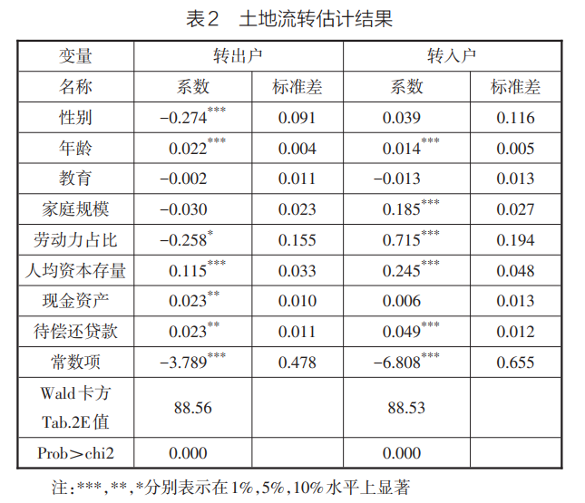 表2表明该模型整体在1%的水平上显著,拟合优度较高。在转出户中,劳动力占比、人均资本存量等对农户土地出租行为的决策影响较大,劳动力占比对农户土地出租行为则是显著的负向影响,表明家庭劳动力占比越小,农户越倾向于土地出租,从事非农就业,获取非农收入,提高家庭收入。在转入户中,家庭规模、劳动力占比等对农户土地转入行为的决策影响较大,家庭规模对农户土地转入行为有着显著正向影响,表明家庭规模越大,农户越倾向于转入土地,规模种植,提高家庭收入。
