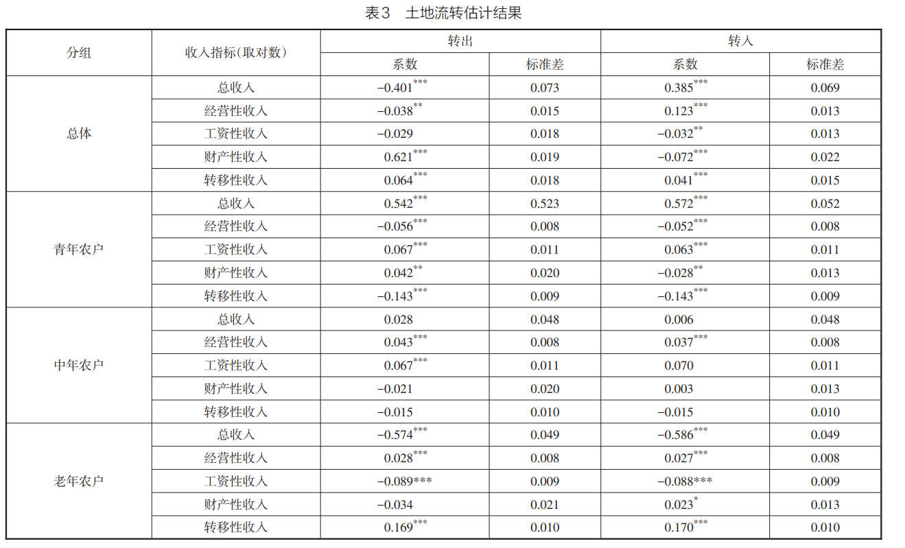 土地流转对农户呈显著增长效应且假说1、2、3皆得到验证。土地转出对青、中年农户的工资性收入呈显著正向影响。土地转入能有效扩大中、老年农户的土地经营规模;对青年农户来说,由于家庭规模、种植经验、农业收益低等的限制,土地经营性收入呈负向显著,青年农户非农收入显著增长使青年农户家庭收入呈正向显著。