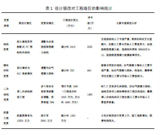 在本次工程中设计修改对工程造价影响如表1所示,具体体现在结构变更墙体材料变更、二次结构变更和桩基工程变更几方面。均导致了不同程度的造价减少和亏损情况。这些变更不仅改变了工程项目的成本构成,而且对施工单位的经济效益造成了严重冲击。如结构变更中全现浇结构的人工和周转材料问题,墙体材料变更后的人工费用亏损,二次结构变更带来的高额人工费用差异以及桩基工程变更导致的利润流失等,都凸显了在 EPC 项目中设计稳定性和合理性对工程造价管理的重要性。