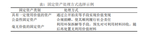 此阶段管理重点主要包含以下内容,①报废鉴定,建立量化评估标准,综合考虑使用年限、维修成本等因素,及时处置失去使用价值的资产,避免占用公共资源。②处理方式优化原则,严格基于固定资产剩余价值以及市场现实需求,制定因地制宜的策略。详情见下表1所示。