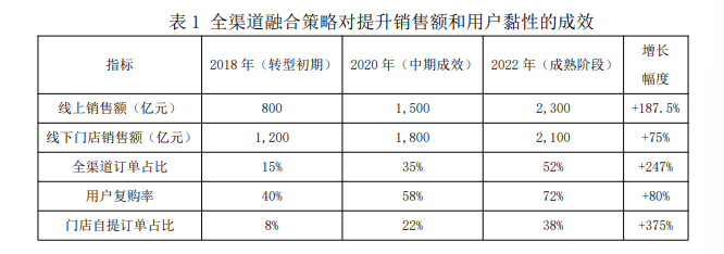 苏宁易购通过全渠道融合实现线上线下同价同款同服务,还收购企业拓展线下渠道。从表1数据看,成效显著。线上销售额从2018年800亿元增至2022年2300亿元,增长187.5%;线下门店销售额也有75%增长。全渠道订单占比、用户复购率、门店自提订单占比均大幅提升,有力提升了销售额与用户粘性,如表一所示。