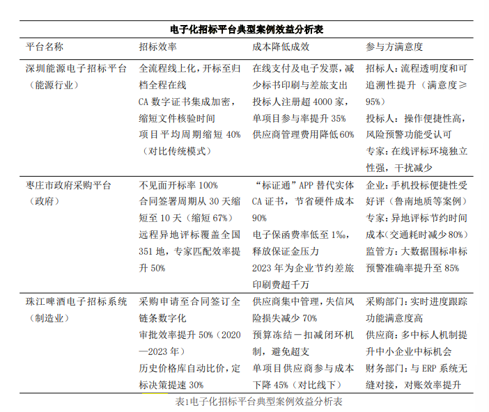 整体电子化招标平台通过流程在线化、风控智能化、数据资产化三重变革,推动企业管理从“经验驱动”转向“数据驱动”。其效能提升不仅体现在显性的成本与效率指标,更通过供应链协同优化和生态资源整合,为企业构建韧性供应链提供底层支撑。未来,随着AI大模型与区块链技术的深度融合,电子化招标平台在管理创新方面必将发挥越来越大的作用,如表1。