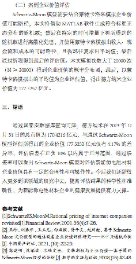 【摘要】在社会和经济的推动下,新能源电池材料企业的未来将会蓬勃发展,精确地评估新能源电池材料企业的价值,不但会影响到行业的发展,也会对投资、融资、合并等经济活动产生影响。目前我国关于新能源电池材料企业价值评估的研究较少,相关企业价值评估方法大多使用传统评估方法,并未将企业的不确定性和高风险性考虑在内。因此,本文引用Schwartz-Moon 模型对新能源电池材料企业价值进行评估,评估出的企业价值与评估基准日的市场总价值误差率在合理的范围内,一方面拓展了Schwartz-Moon 模型的适用范围;另一方面也为新能源电池材料企业价值评估探索出新的评估方法。