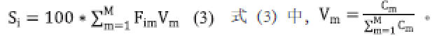 在计算各主成分得分的基础上,计算各新能源上市车企的综合评价得分。因为各个主成分的方差贡献率不同,各个主成分的得分计入综合评价分的权重有所不同,以各个主成分的方差贡献率为分子、以所有主成分的方差贡献率之和为分母,记为每一个主成分权重,计算综合评价得分,为了直观和容易比较,把得分稍作转换。不妨令Ck 为第k 个主成分的方差贡献率,Vk 为第k 个主成分的加权方差贡献率,Si 为第i 个企业综合得分,如下式