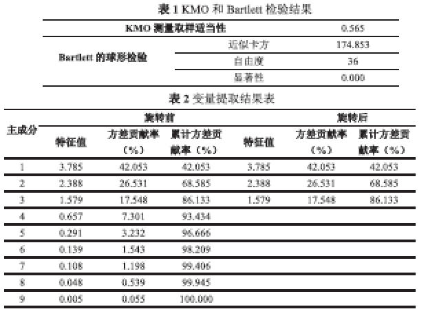 在应用主成分分析的过程中,经过反复比较和调试,最终在以上四个层面选取了9 个指标。盈利能力的指标为: X1 表示每股收益(元),X2 表示净资产收益率(%),X3 表示总资产收益率(%);偿债能力的指标为:X4 表示流动比率(%),X5 表示速动比率(%);营运能力的指标为:X6 表示固定资产周转率(次),X7 表示存货周转率(次);研发能力的指标为:X8 表示研发费用占营收比率(%),X9 表示研发费用增长率(%)。