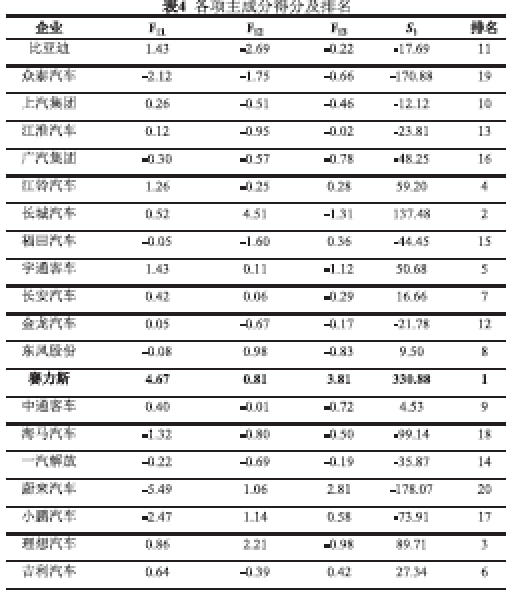 最后,根据式(3),计算由式(4)、式(5)和式(6)得出每一个新能源上市车企的三个主成分得分(需要说明一点的是,由于SPSS 22.0功能的增强,可以直接给出各主成分得分)。根据各主成分的权重,计算得出综合得分,进而以此进行排名,见表4。