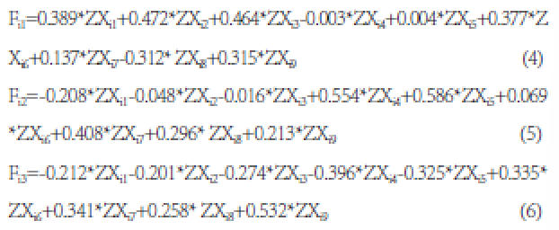 在表2 和表3 的基础上,把主成分载荷向量除以各自主成分特征值的算术平方根,以此构成主成分系数矩阵,由主成分系数矩阵可以得出主成分的解析表达式,见式(4)、式(5)和式(6)。