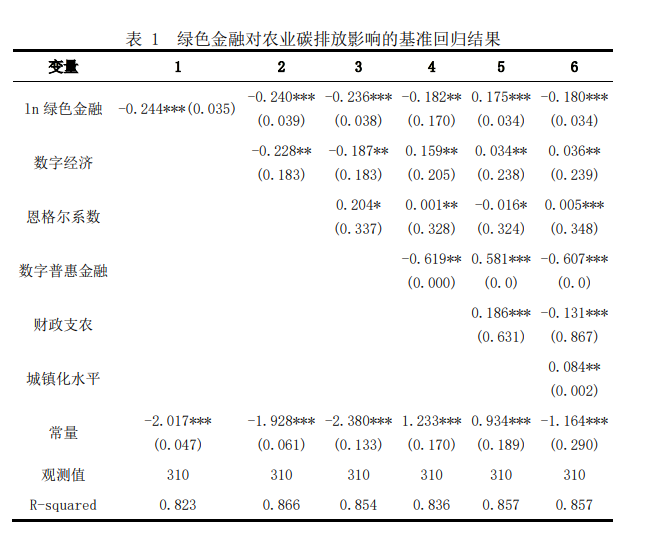 本次研究共涉及 7 个变量,有效样本量 N 均为 310,根据统计结果得到各指标标准差:农业碳排放强度:0.3849、恩格尔系数:0.0611、财政支农:0.0337,数字普惠金融:78.7756、城镇化水平:13.1377、绿色金融指数:0.1307、数字经济:0.1130。