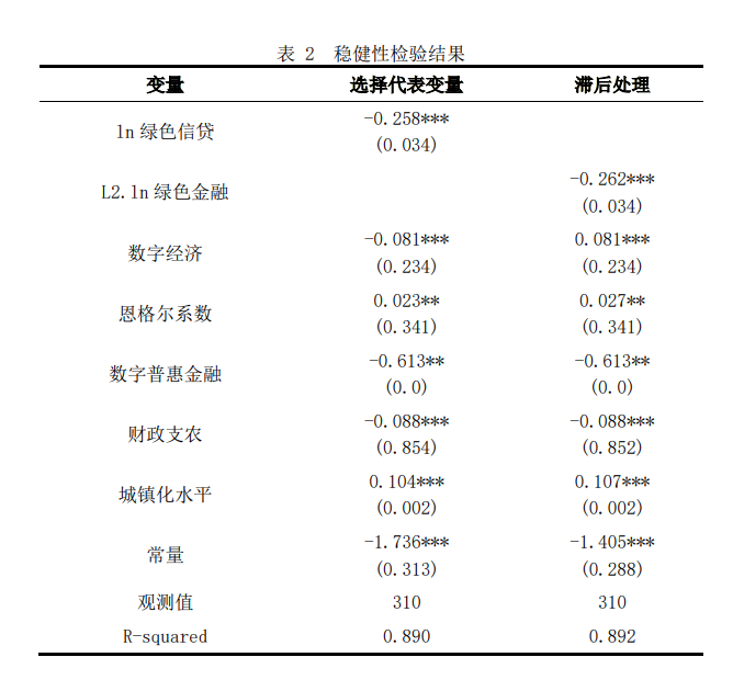 稳健性检验中本研究选取绿色信贷指数作为代表变量进行回归分析。结果显示,回归系数为 -0.258,1% 水平下显著。这一数据直观表明,绿色信贷规模每提升一个单位,都会对农业碳排放产生显著的抑制作用。同时本研究通过设置滞后项,更准确地捕捉绿色金融和农业碳排放时间上的延迟关系,使用绿色金融指数的滞后项回归,结果仍显示绿色金融对农业碳排放具有显著负向影响。使用二阶滞后绿色金融变量(L2.lnGF)估计,其系数约为 -0.262,标准误差 0.034,在 1% 的水平上显著,绿色金融对农业碳排放的抑制作用具有一定持续性,前期绿色金融发展能在后期对农业碳减排产生影响。