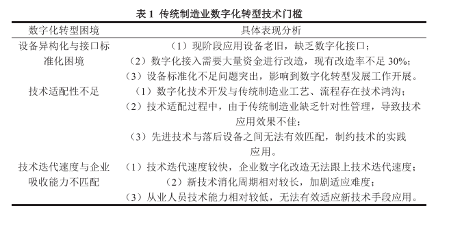 传统制造业数字化转型发展过程中,面临着一定的技术壁垒,这给传统制造业发展带来较大的困境。关于传统制造业面临的高技术门槛壁垒,具体如表 1 所示: