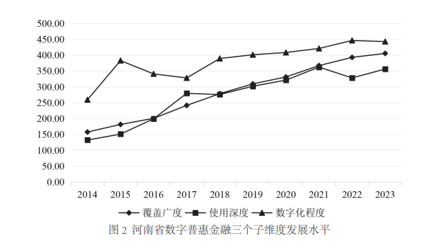 数字化程度是衡量服务质量和效率的重要维度,反映了数字普惠金融在提供便捷高效服务方面的能力。河南省数字普惠金融数字化程度从 2014 年的 260 增长至 2023 年的 450.00 左右,总体呈现稳步上升态势,其中在 2015—2017 年出现短期波动,此后虽又恢复增长,但增速开始下降,表明河南省在技术创新和数字化转型方面有所放缓。