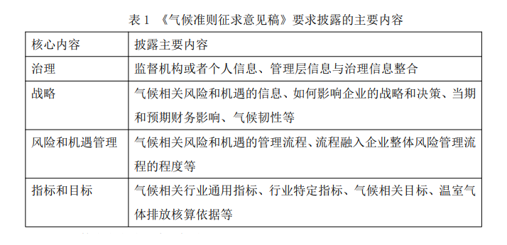在 2024 年底发布的可持续披露基本准则(以下简称“《基本准则》”)的基础上,2025 年 4 月 30 日,财政部积极借鉴国际准则,联合生态环境部发布《企业可持续披露准则第 1 号——气候(试行)》(征求意见稿,以下简称“《气候准则征求意见稿》”),并面向社会公开征求意见。该准则全文共分六章,其中,治理、战略、风险和机遇管理、指标和目标为其四项核心内容,需要披露的主要内容如下表所示。