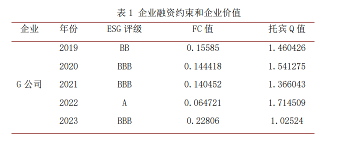 本研究采用托宾 Q 值衡量 G 公司的企业价值,该指标整合企业财务状况与市场资产定价,兼顾货币时间价值,通过对比资产市场价值与重置成本,有效反映企业内在价值与市场价值的关联。据薛天航等(2022)的最新研究,ESG 绩效卓越的企业更受融资市场的青睐,其面临的融资约束显著降低。这是因为,ESG 表现佳的企业倾向于展现出更强的信息披露意愿,这显著提升了企业的信息透明度,有效降低了投资者面临的不确定性。