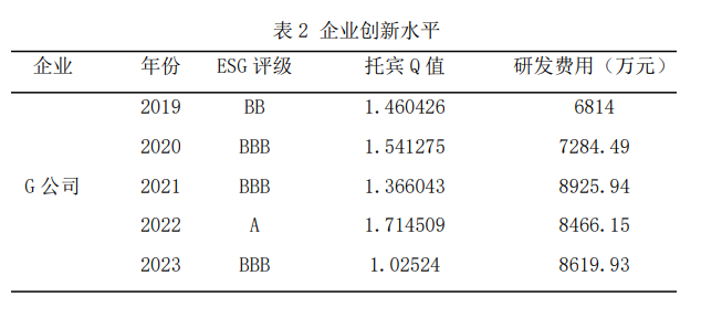 良好的 ESG 表现可以激励企业创新并提升价值。李慧云等(2022)指出相关理念能激活创新思维。本研究以产品研发费用衡量 G 公司创新水平,2021—2023 年其研发费用从 6814 万元升至 8619.93 万元,表明 ESG 可促进创新并提升企业价值。在制造业中,不同细分领域存在明显差异。如高端装备制造企业,创新投入高,在 ESG 推动下可吸引高端人才与研发资源,提升企业价值;而传统机械制造企业,创新可能侧重于工艺改进,ESG 引导的创新对成本控制与效率提升的作用显著,从而间接影响企业价值(表 2)。