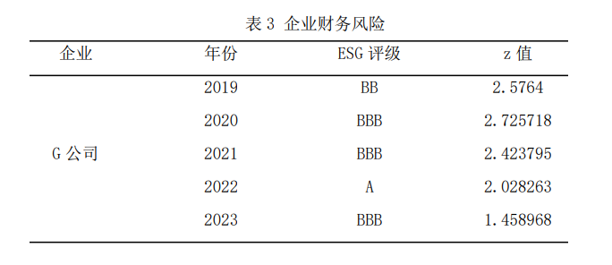 ESG 优势可降低财务风险,提升企业价值。高华(2024)认为其可缓解资金压力、树立企业形象、降低风险。奥特曼 Z - Score 模型显示,Z 值与财务危机可能存在负相关。G 公司 2021—2022 年财务状况良好、Z 值稳定,2023 年受市场影响 Z 值下降、风险上升,说明 ESG 可降低风险并提升企业价值。ESG 信息披露增加透明度、减少信息不对称。在制造业,原材料供应稳定是关键。ESG 表现好的企业与供应商关系更稳定,可保障生产连续性。如 G 公司若能在供应链管理中践行 ESG 理念,与环保、社会责任履行好的供应商合作,可减少原材料价格波动与供应中断风险,提升财务稳定性(表 3)。