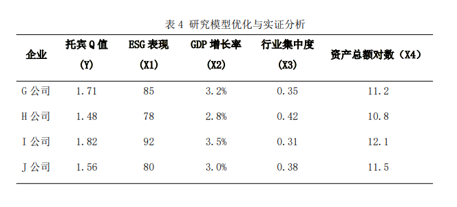 原研究仅简单对比数据并使用现有指标进行衡量,存在一定局限性。现引入多元回归模型并控制变量。设因变量为企业价值(Y),用托宾 Q 值衡量;自变量为 ESG表现(X1),综合环境、社会和治理评分;控制变量有宏观经济环境(X2),用 GDP 衡量;行业竞争程度(X3),用行业集中度指标;企业规模(X4),用资产总额对数表示。收集同行业多家企业数据构建模型:Y = β0 + β1X1+ β2X2 + β3X3 + β4X4 + ε。经数据分析,若结果显示ESG 表现系数显著为正,表明在控制其他变量后,ESG 仍对企业价值有正向影响,且可量化其影响程度。相比原研究方法,可大幅提升研究结论的准确性与可靠性(表 4)。