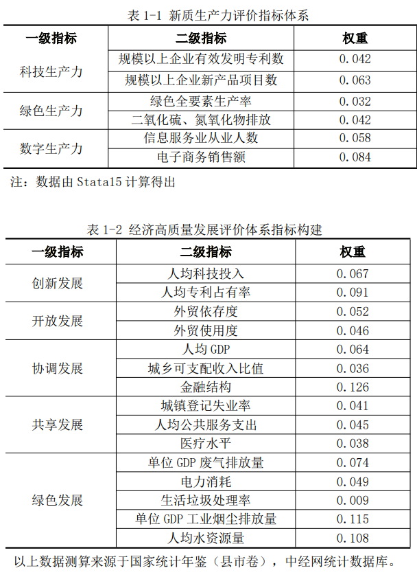新质生产力(NQP)。本文选择具体包含科技生产力的 3 个一级指标、规模以上企业有效发明专利数在内的6 个二级指标,并采用熵值法进行指标权重测算,具体结果如下表 1-1 所示。