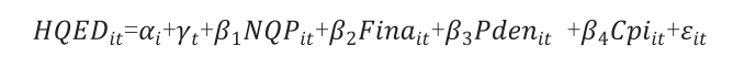 该模型中 HQED 表示经济高质量发展,NQP 表示新质生产力水平,控制变量中,Fina 金融发展水平,Pden城市人口密度,Cons 社会消费水平。