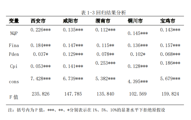 本文对关中平原地区五个地区的数据建立固定效应模型进行回归分析,模型的回归结果如下表 1-3: